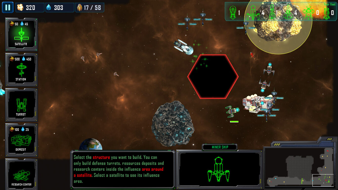 この宇宙アクションと戦略ゲームでは、艦隊を構築するために必要なリソースを見つけるために努力している人間の力を指揮しています。 数隻の鉱山船と探査機から始めて、貴金属と水を抽出するために、採掘可能な小惑星帯を見つけて征服することが使命です。