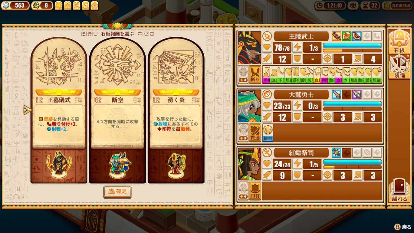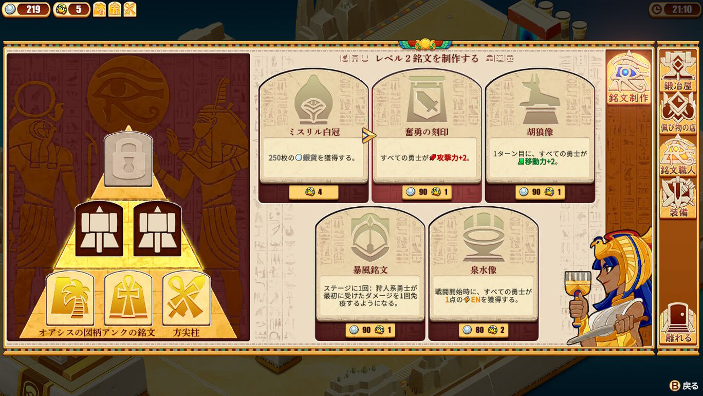 戦士をレベルアップさせ、新たな石板や装備を解放する。