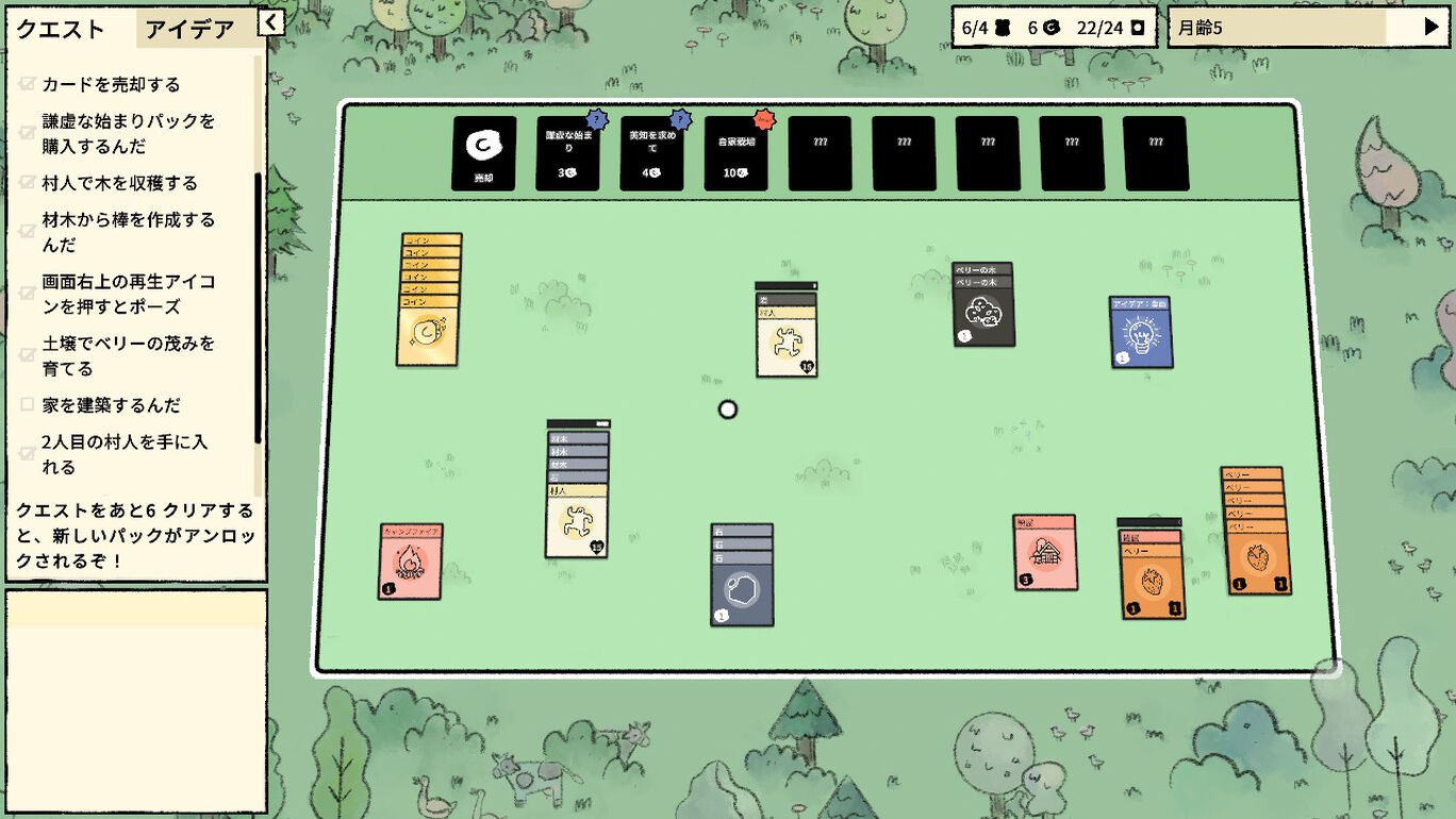 アイデアカードを見つけることで、知識を深めることができる。例えば、「材木」を2枚、「石」を1枚、「村人」を1枚を重ねて「家」を建てるなど、「アイデアカード」には新しいカードの作り方が書かれている。
