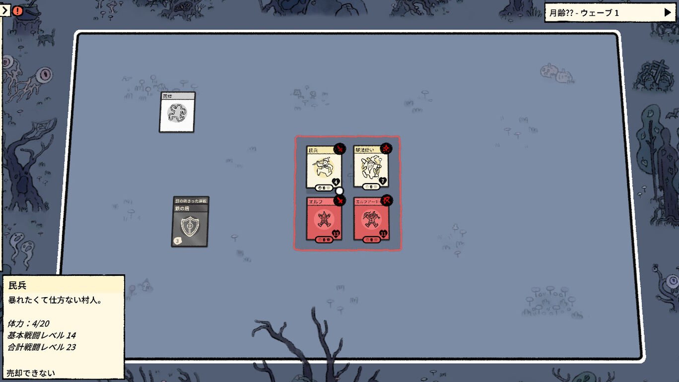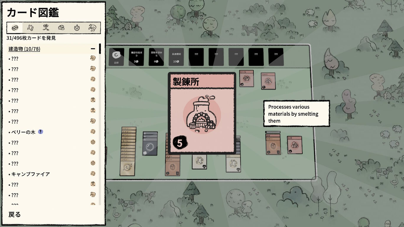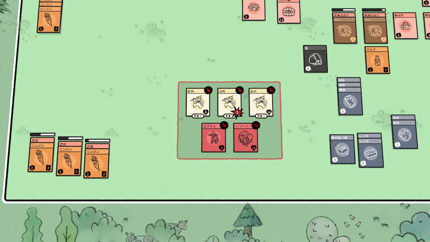 カードを重ねて食料を集め、建造物を建て、クリーチャーと戦う村づくりゲームだ。