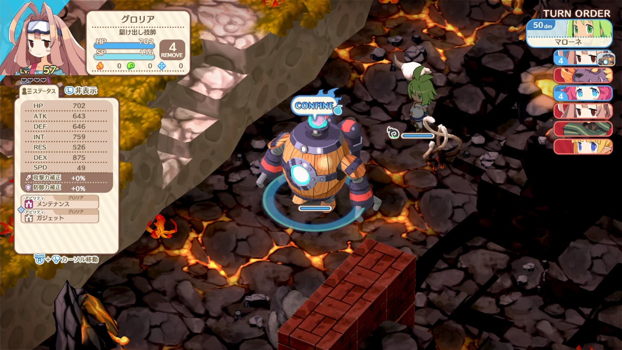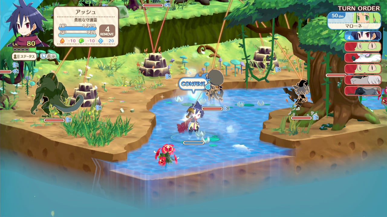 戦闘では仲間のファントムたちをマローネの能力によって、マップ上の木や岩やアイテムに憑依(コンファイン)して戦闘に加えることが出来ます。何にコンファインするかで戦略は無限大!!