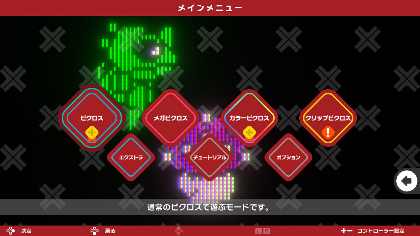 ピクロスSシリーズでおなじみの「ピクロス」「メガピクロス」「カラーピクロス」「クリップピクロス」4つのピクロスモードと、おまけコンテンツ「エクストラ」を搭載しています。