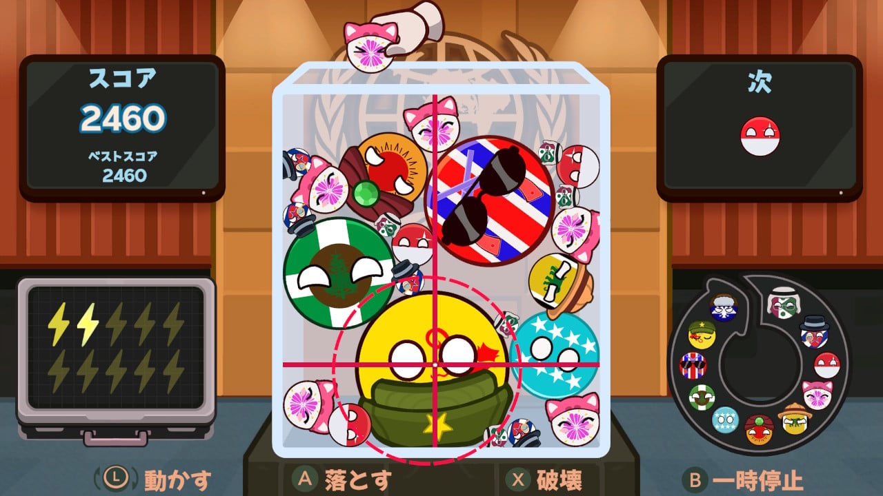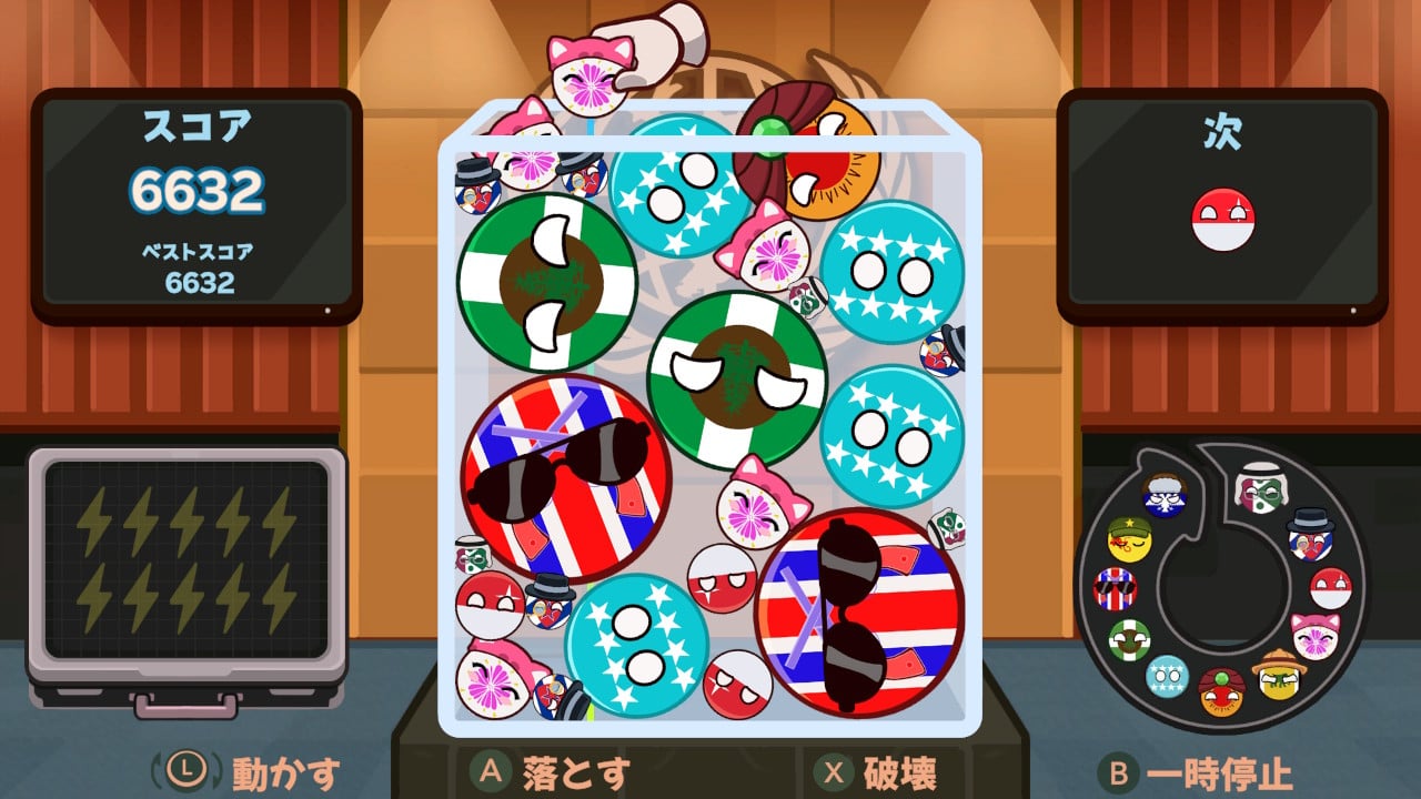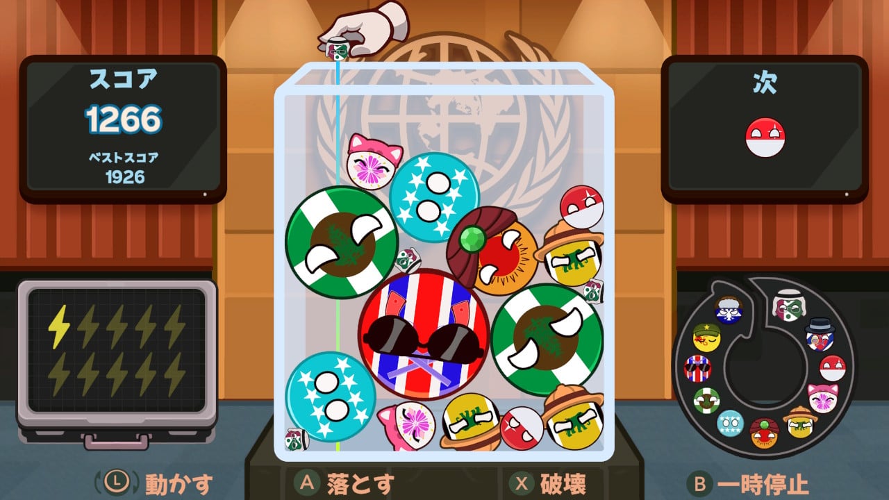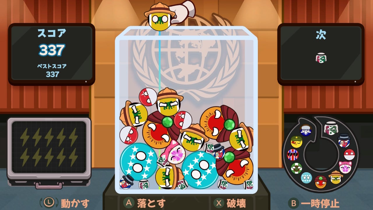 事務総長であるあなたの役目は、ちいさなカントリーボールを箱の中に落として、大きなボールへと合体させていくこと。ですが、いたずら好きのボールが跳ね回るのでご注意あれ! 箱の中にしっかりおさめないと、解任(ゲームオーバー)されてしまいます。