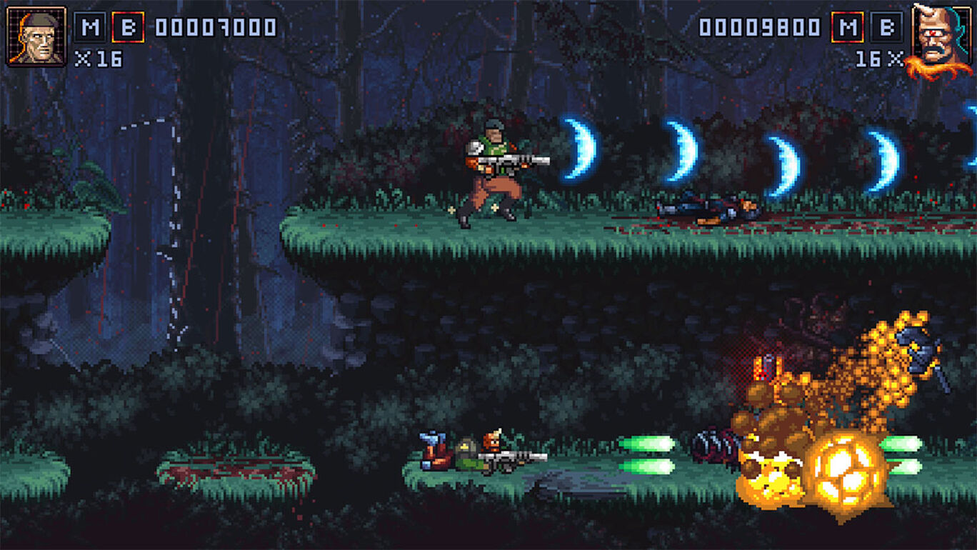 『Iron Meat』では、過去の「ガン&ラン」ゲームの名作に倣って、敵に複数の形態変化が起こる白熱のボス戦が用意されている。プレイヤーは、3種類の難易度から選択してプレイでき、難易度が高くなればなるほど、ボス戦での自分の腕前が試されることになる。