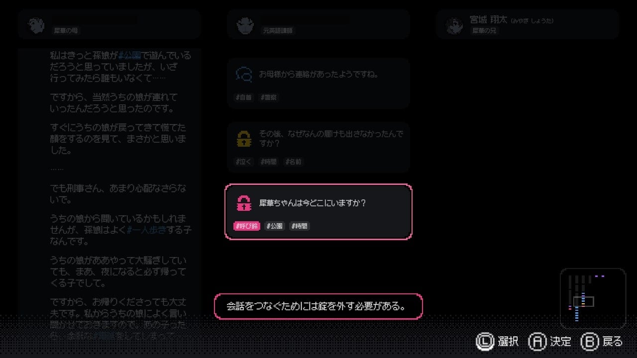 ・2~3時間のプレイタイムを経て、清崎蒼が犀華の行方不明を唯一の未解決事件にした理由が明らかになります。