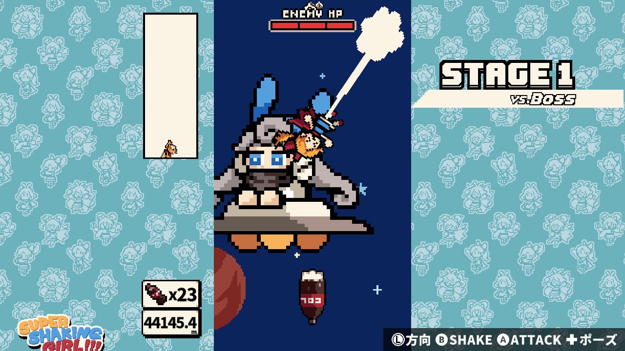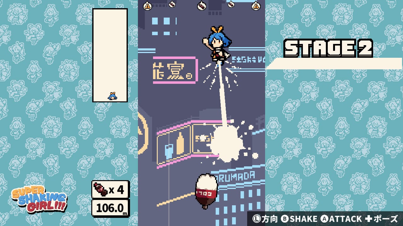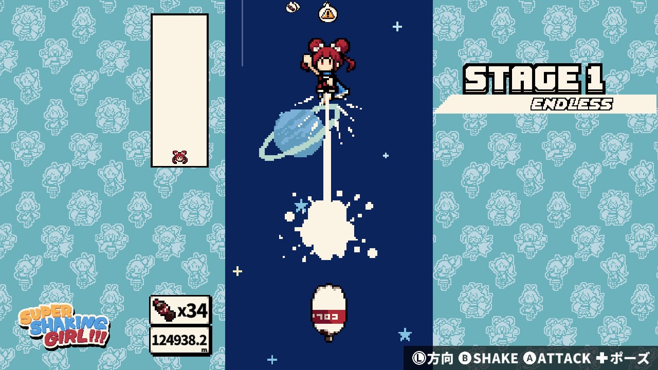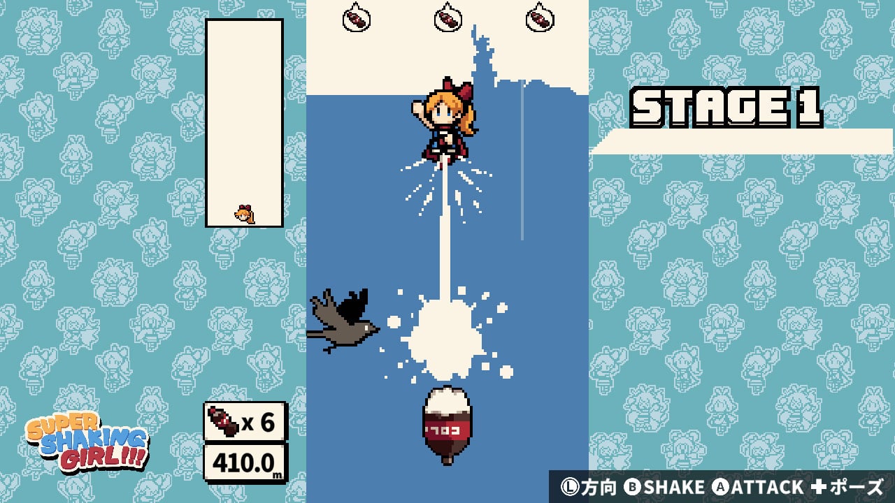 『SUPER SHAKING GIRL!!!』は、コーラを振って振って飛びまくる爽快アクションゲーム。コーラのシュワシュワパワーで空に飛び、空中で更にコーラを振って飛んで振って飛んで、どこまでも上を目指しましょう。