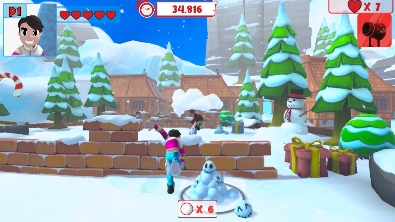▼雪合戦:壁の向こうにいる対戦相手に雪玉を投げ、ライフを削ろう。雪玉を投げ尽くしたら、壁に隠れて身を守りつつ、リチャージしよう。