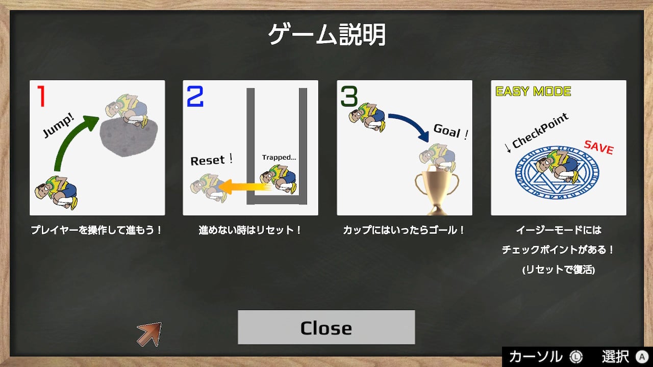 ステージ選択後に、チェックポイントのある「イージーモード」と、チェックポイントのない「ノーマルモード」を選択するができますので、アスレチックゲーム初心者の方でも安心してプレイすることができます。