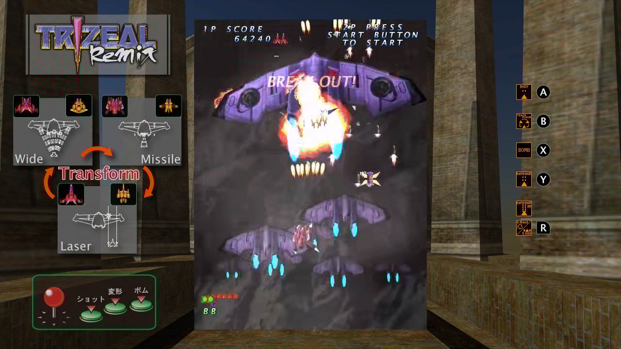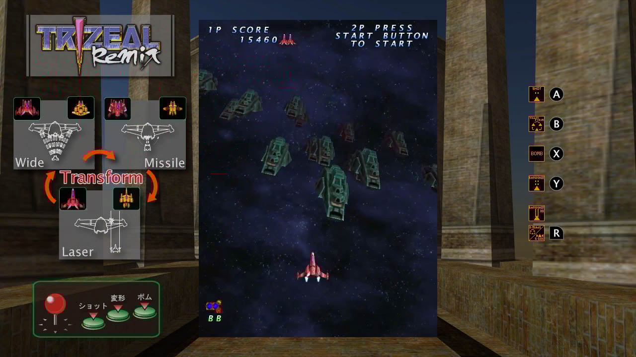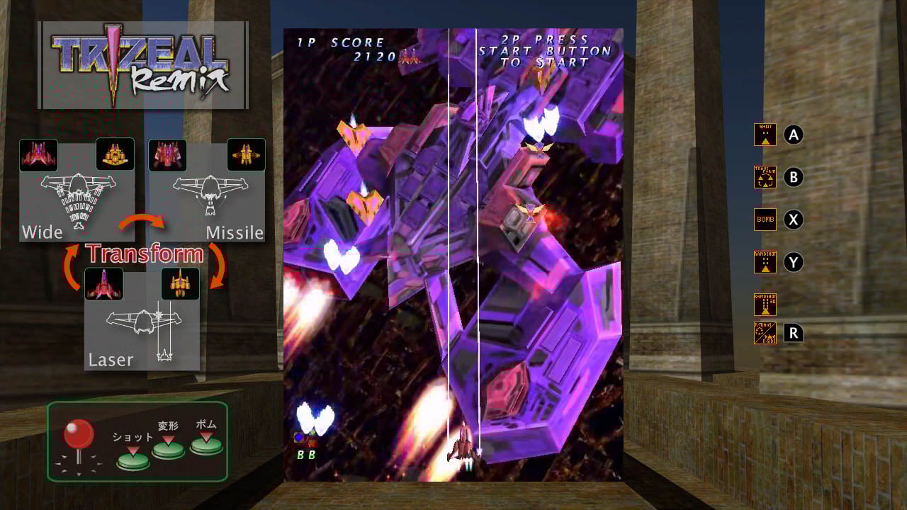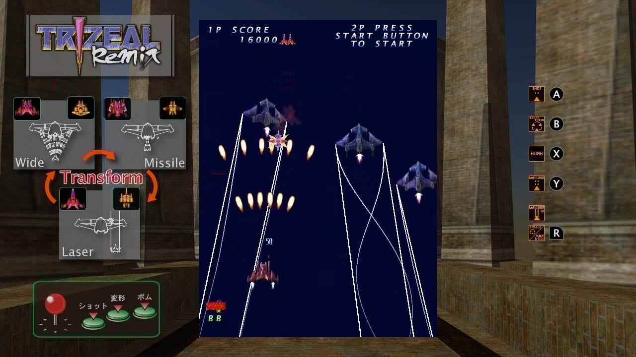 ショット、変形、ボム、3つのボタン、ワイド・レーザー・ミサイル、3種の武装を駆使して個性豊かなステージを攻略だ!