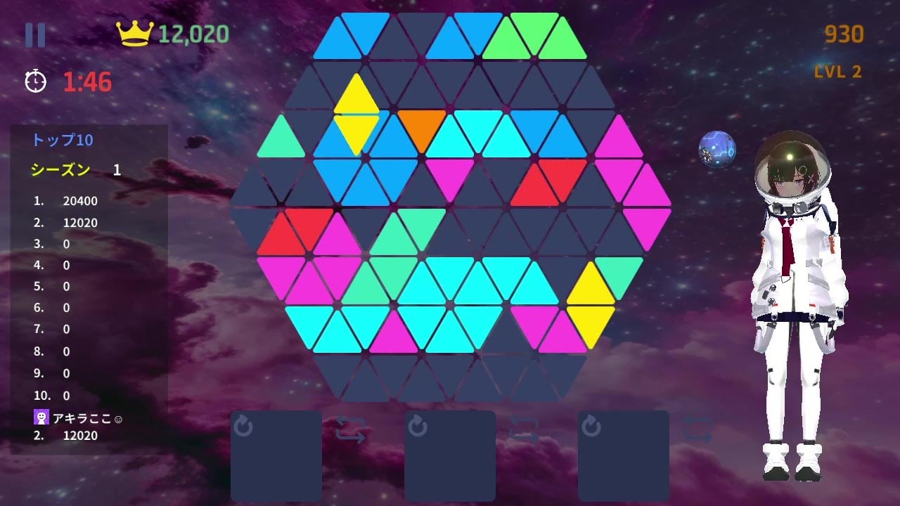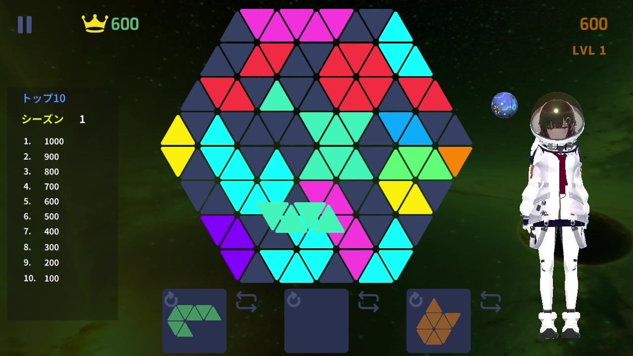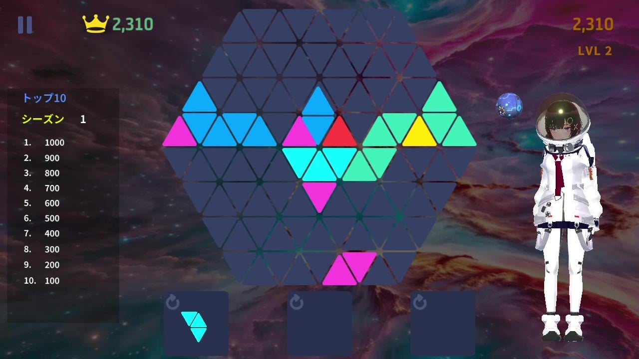 背景: 近未来、人類は宇宙を制覇しました。しかし、火星軌道上の宇宙ステーションのシールドが小惑星によって損傷し、修理用AIロボットも故障しています。三角形のブロックを配置して縦、横、斜めにラインを作り、宇宙飛行士アキちゃんがシールドを修理する手助けをしましょう。