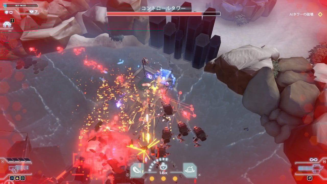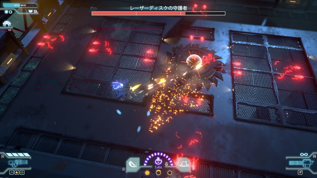 ゲームが進むにつれて、ショットガンやオートライフル、プラズマブーメラン、ロケットランチャーまで、新しい武器が解放されていく。武器はそれぞれ得意とする状況や敵を持つ。大群に対して壊滅的な威力を発揮するものもあれば、重装甲の敵に適したものもある。武器はペアで装着可能だ。あらゆる場面で活躍できるお気に入りの組み合わせを見つけよう。