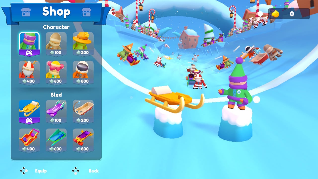 ソリを選ぼう!昔ながらの木製ソリから超高速の未来のソリまで、お気に入りを見つけよう。クールな色とエフェクトでソリを輝かせよう。