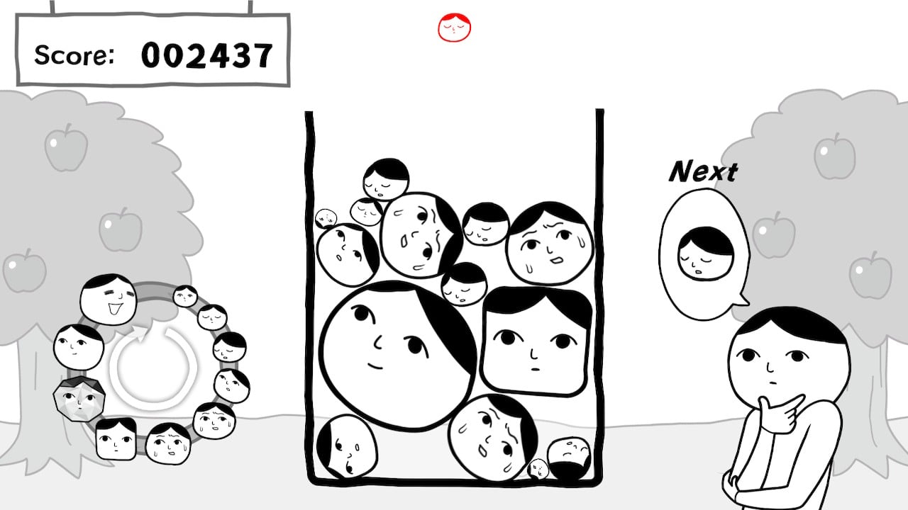 箱から「お前」がこぼれたらゲームオーバーになってしまうので同じサイズの「お前」どうしを効率良くくっつけるのが高得点のコツです。