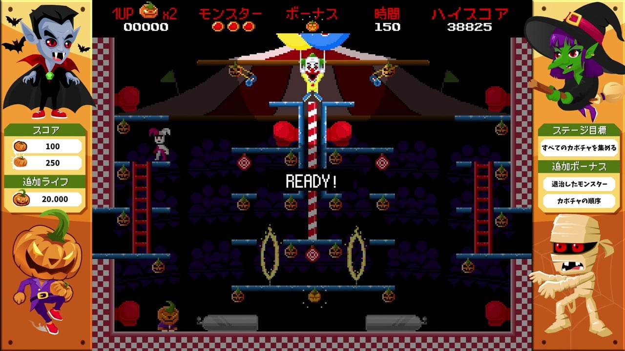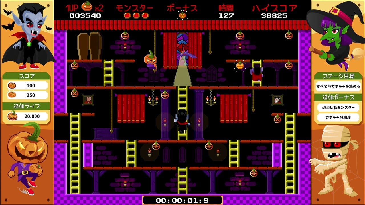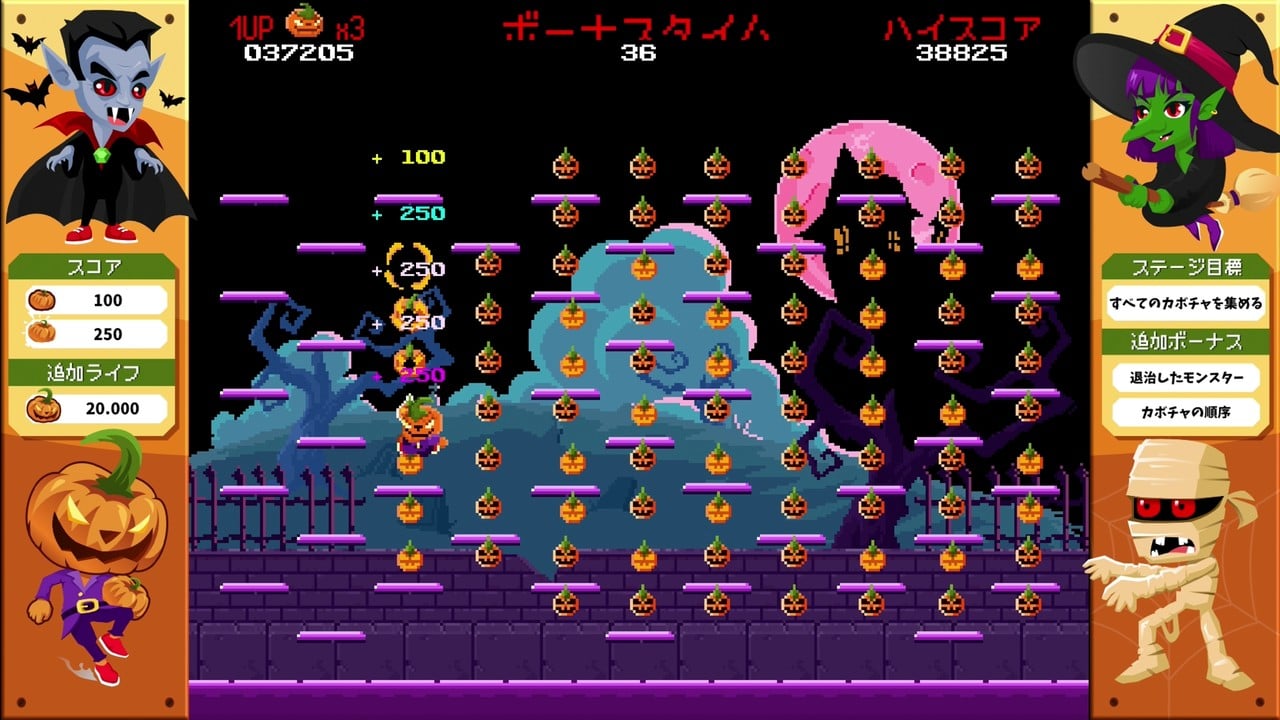 ハロウィーンの夜、パンプキンマンのカボチャがモンスターたちに盗まれてしまった…それを取り戻せるのはきみだけだ!ドラキュラ、ミイラ、魔女など、クラシックなモンスターたちを出し抜きながら、賑やかで風変わりな、5 つのステージを駆け抜けろ!ジャンプして、回避して、戦って、モンスターたちの隠れ家までたどり着き、最後に待ち受ける巨大なボスに挑戦!