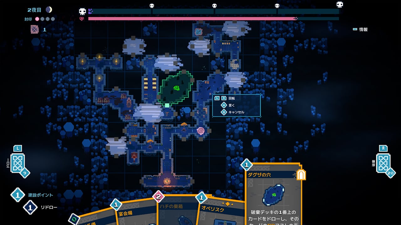 • ダイナミックなデッキ構築とダンジョン構築:様々なカードで部屋や通路などを設置して、自分だけのダンジョンを作り出そう。乙女の寵愛や、古跡の中にいるキャラクターとのやり取りを通じてデッキの構成を変えられる。