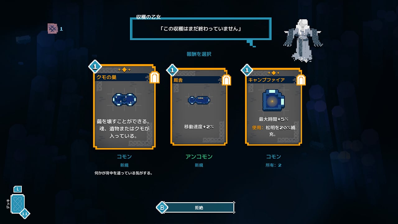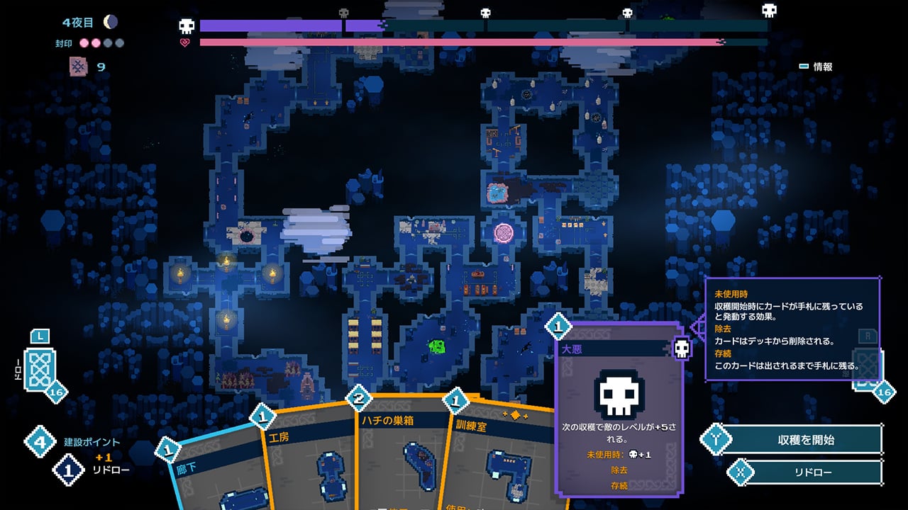 部屋や廊下のカードで構築されたデッキを使い、古跡の迷宮を拡大しよう。ヴァンサバライクの戦闘で古跡の中を進み、松明が闇に飲み込まれる前に、巣食う獣たちから魂を収穫しよう。