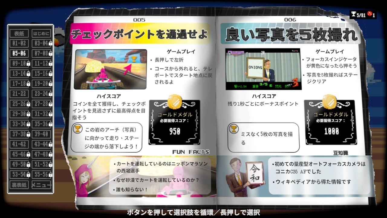 各ステージは、様々な時代のゲームからインスピレーションを得ており、ゲームの歴史へのパロディやオマージュも含まれている。レース場でドリフトするもよし、レトロなFPSで魔物をなぎ倒すもよし、豪華なJRPGで25秒間の恋を見つけるもよし、次に何が起こるかわからない!