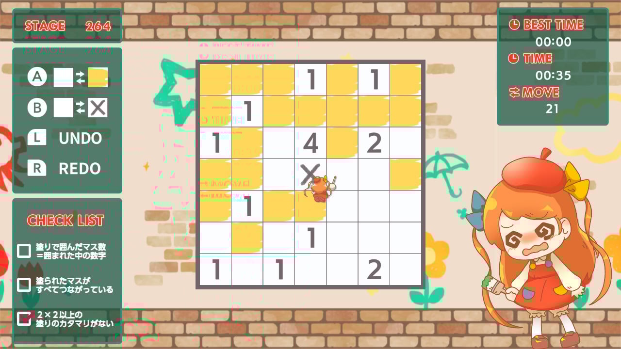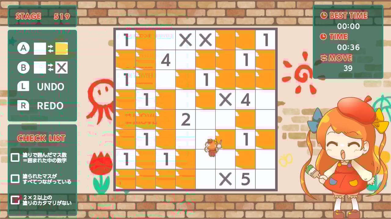 ルール通りにマスを塗り分けることができたらステージクリアです。