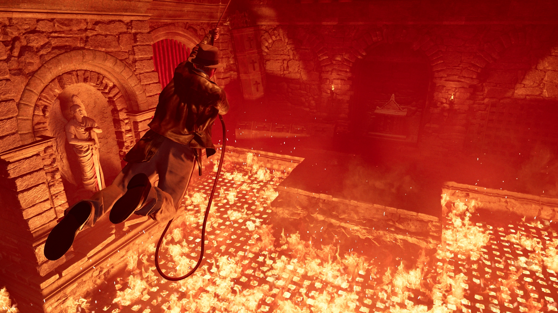 インディのトレードマークである鞭はもちろんメイン装備として敵の陽動や無力化や攻撃に使用できるが、単なる武器に留まらず、インディの移動時に最大の効果を発揮する。無警戒状態の見張りの頭上をスイングしてやり過ごしたり、壁をよじ登ったりして、美しい世界を進んでいこう。ステルスによる潜入、興奮の接近戦、そして銃撃戦を組み合わせて敵の脅威に立ち向かい、謎を暴こう。