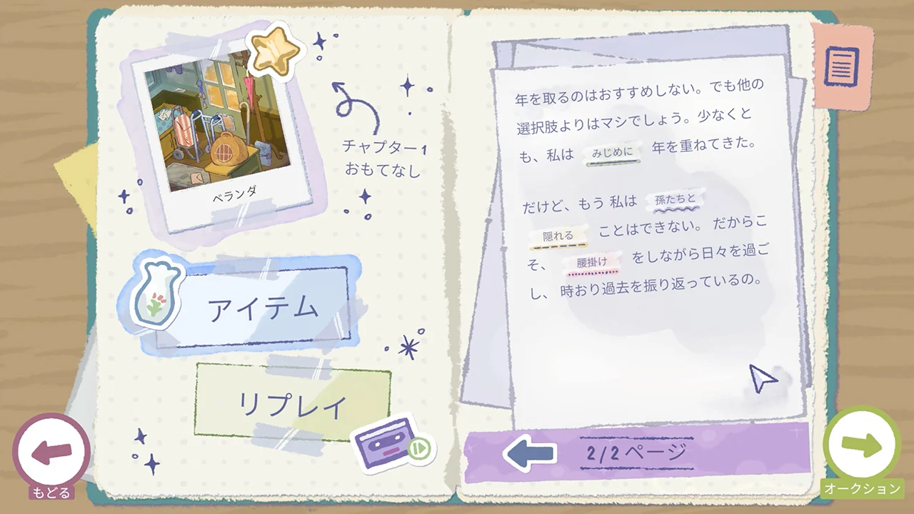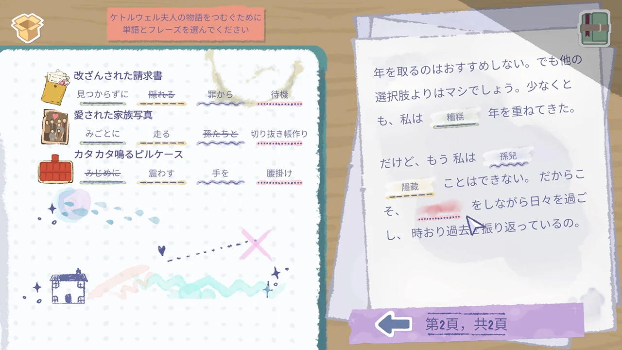 アイテムを保存していくと、関連する単語のセットがアンロックされます。これらの単語を使用して、損傷した回想録の空白を埋めてください。文を完成させることで、物語に満ちた人生が明らかになります。