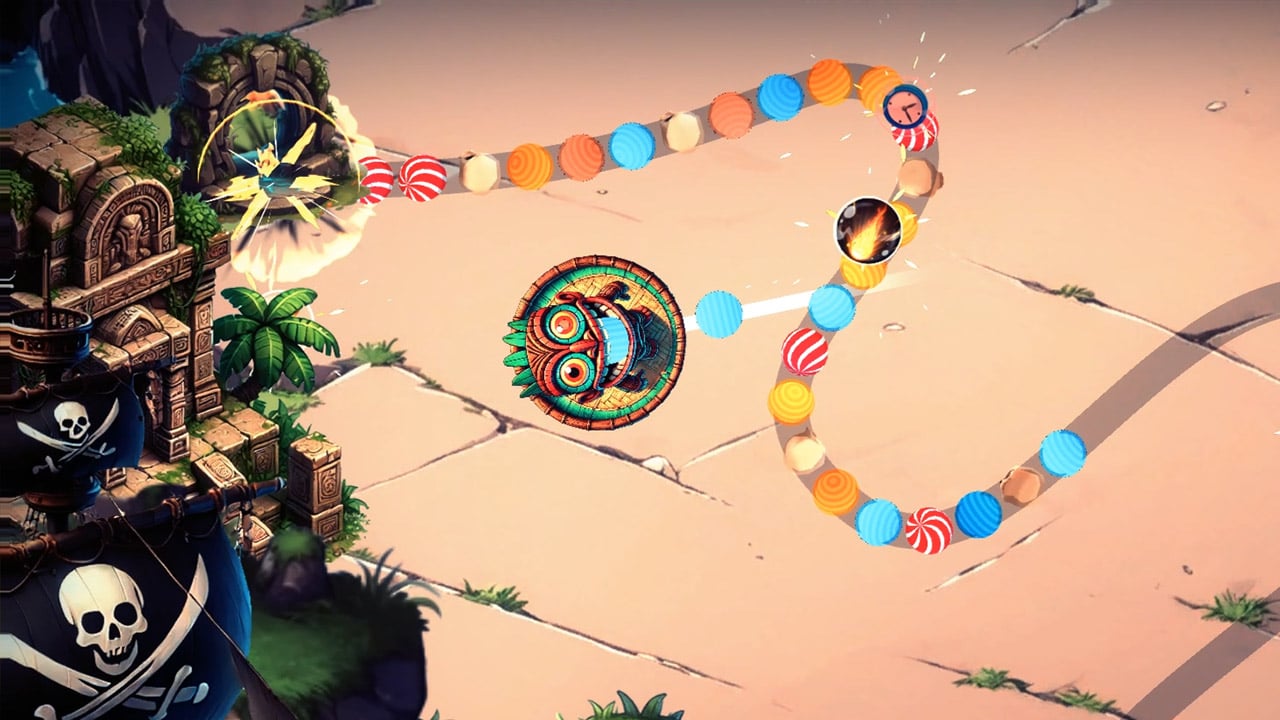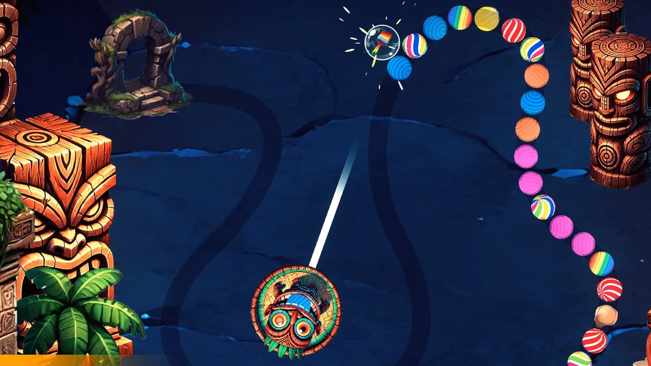 ステージを選択したら、戦士を曲がりくねったジャングルの道の中央に配置し、ビー玉を発射して3つ以上の同じオーブを揃えましょう。目まぐるしい連鎖反応を引き起こし、ウェーブを素早くクリアし、遺跡の境界をビー玉が通り抜けるのを防ぐことで、最大3つ星を獲得できます。
