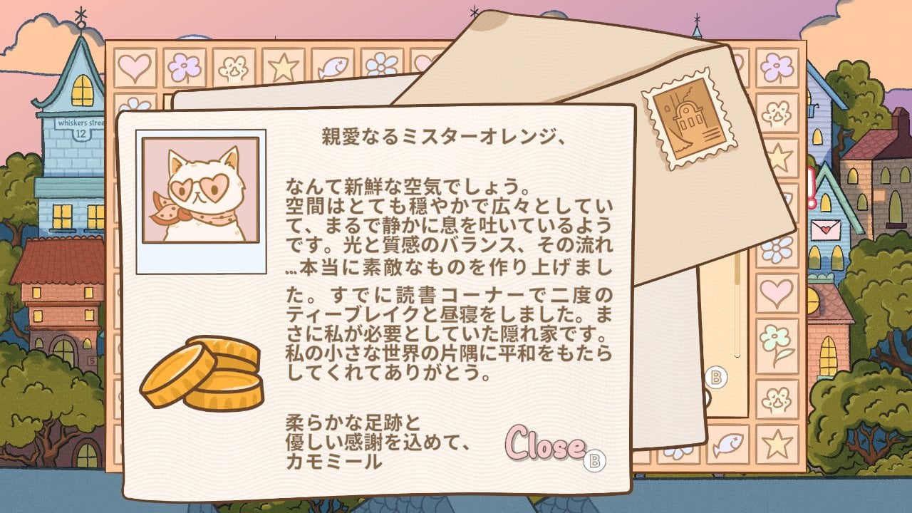 『猫たちの居心地のいいお部屋』では、あなたはMr. Orangeとなって、町に住むモフモフな猫たちのお部屋をおしゃれで快適な空間に変身させていきます!