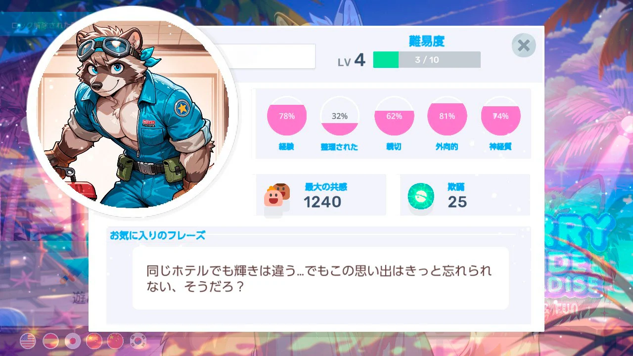 短くテンポの良いミニゲームに挑戦し、成功するたびに新しいイラスト、コメント、リアクションが解放され、周囲の獣人男子たちが持つそれぞれの魅力やスタンスが少しずつ見えてきます。