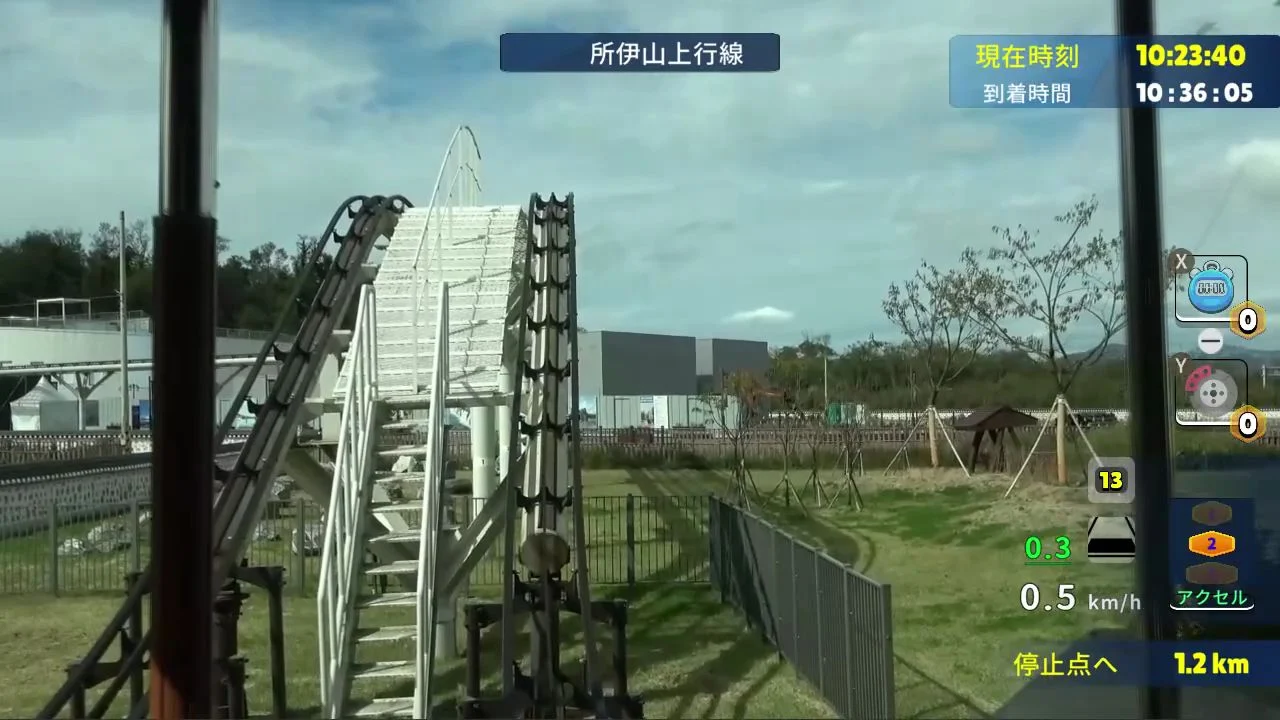 実際のモノレール運転のように加速・減速、停車、など細かい運行操作が必要。