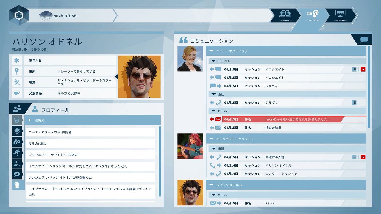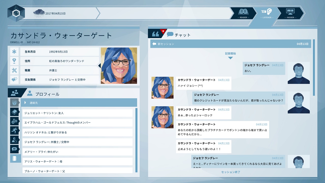 チャット通信を盗聴し、個人メールを読み、PCをハッキングし、医療ファイルを抜き取り、人脈を作る。必要な情報を見つける。