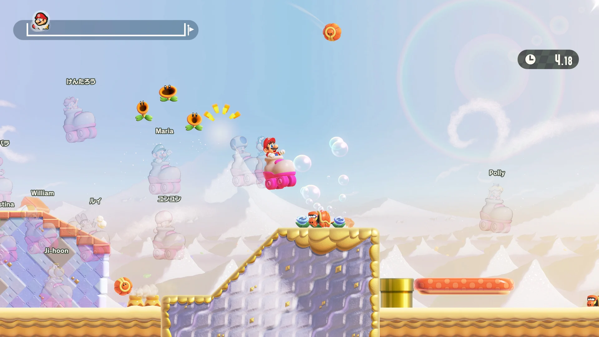 クッパに乗っ取られた「フラワー王国」を救うため、マリオと仲間たちは敵や仕掛けを突破しながら、ゴールポールを目指して駆け抜けます。