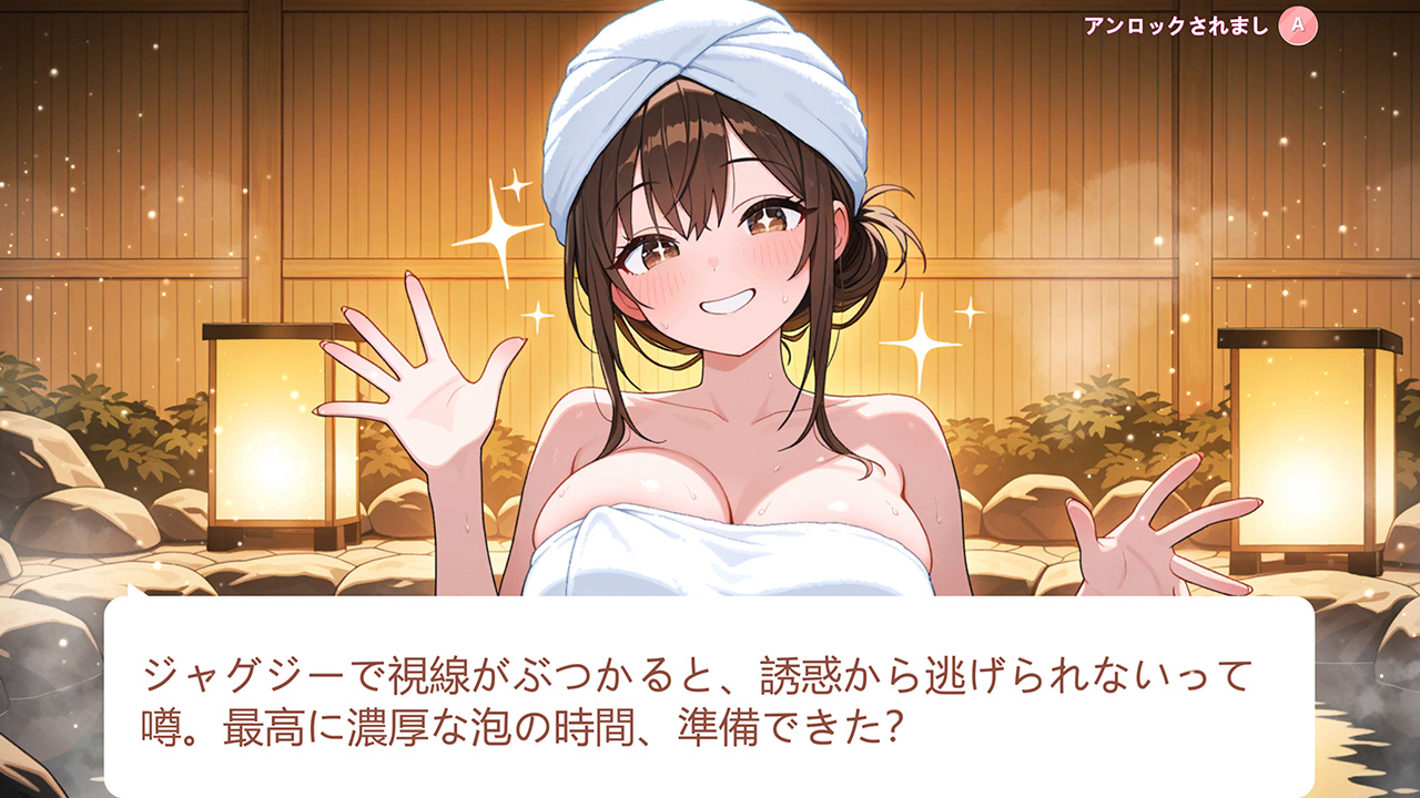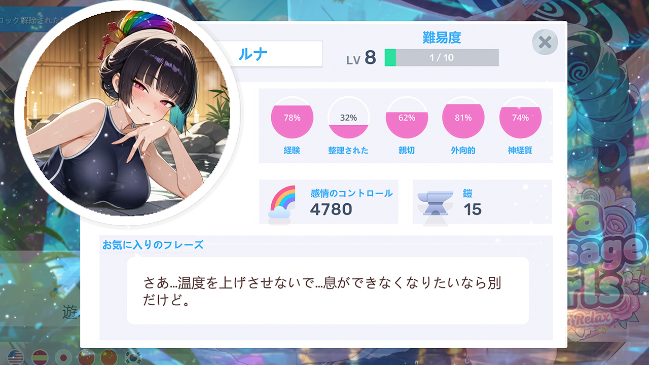『スパ マッサージ 美少女 恋愛リラックス』では、心地よいマッサージミニゲームを楽しみながら、魅力あふれる女の子たちと軽やかで少しドキッとする会話を通して仲を深めていきます。