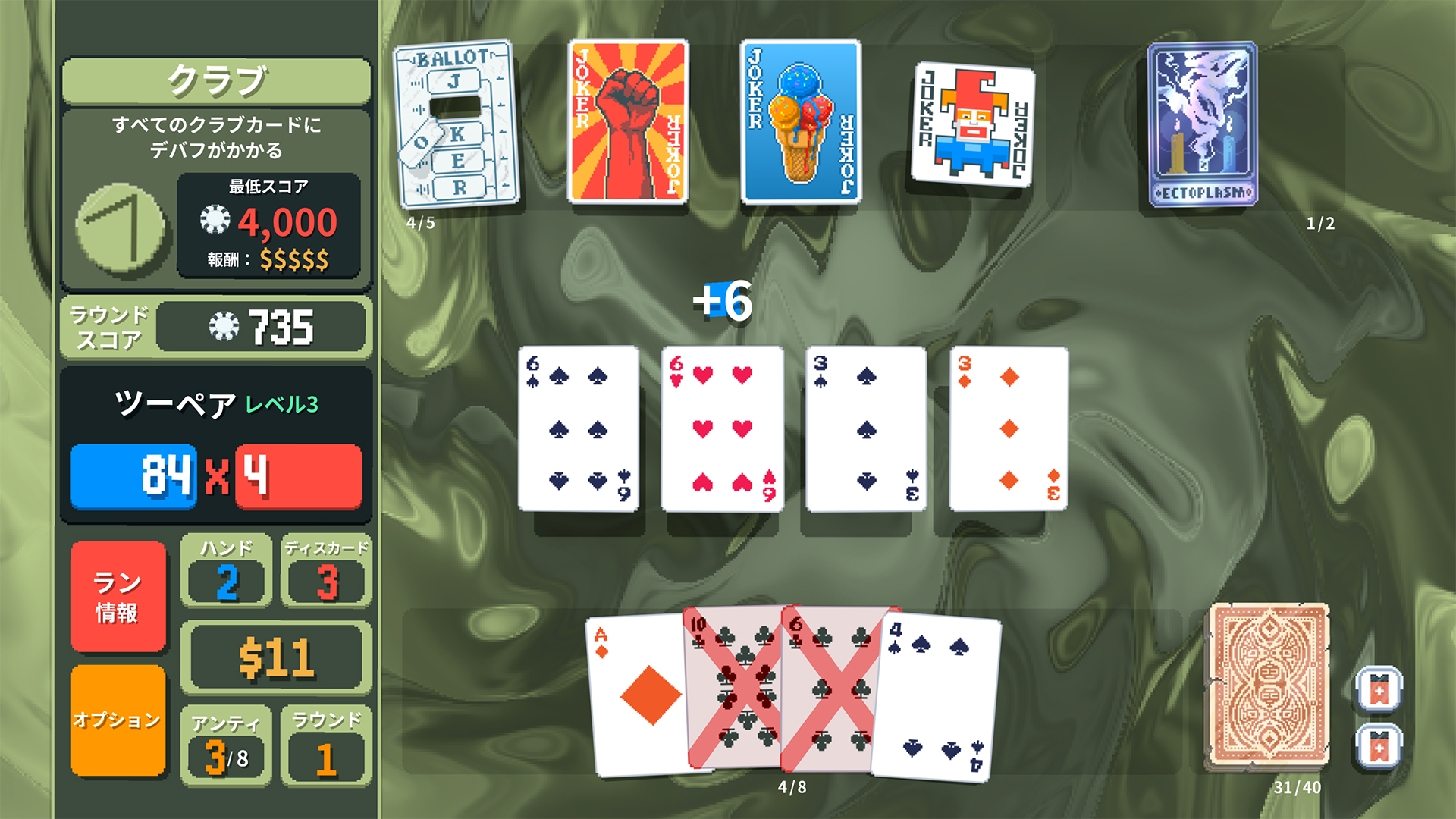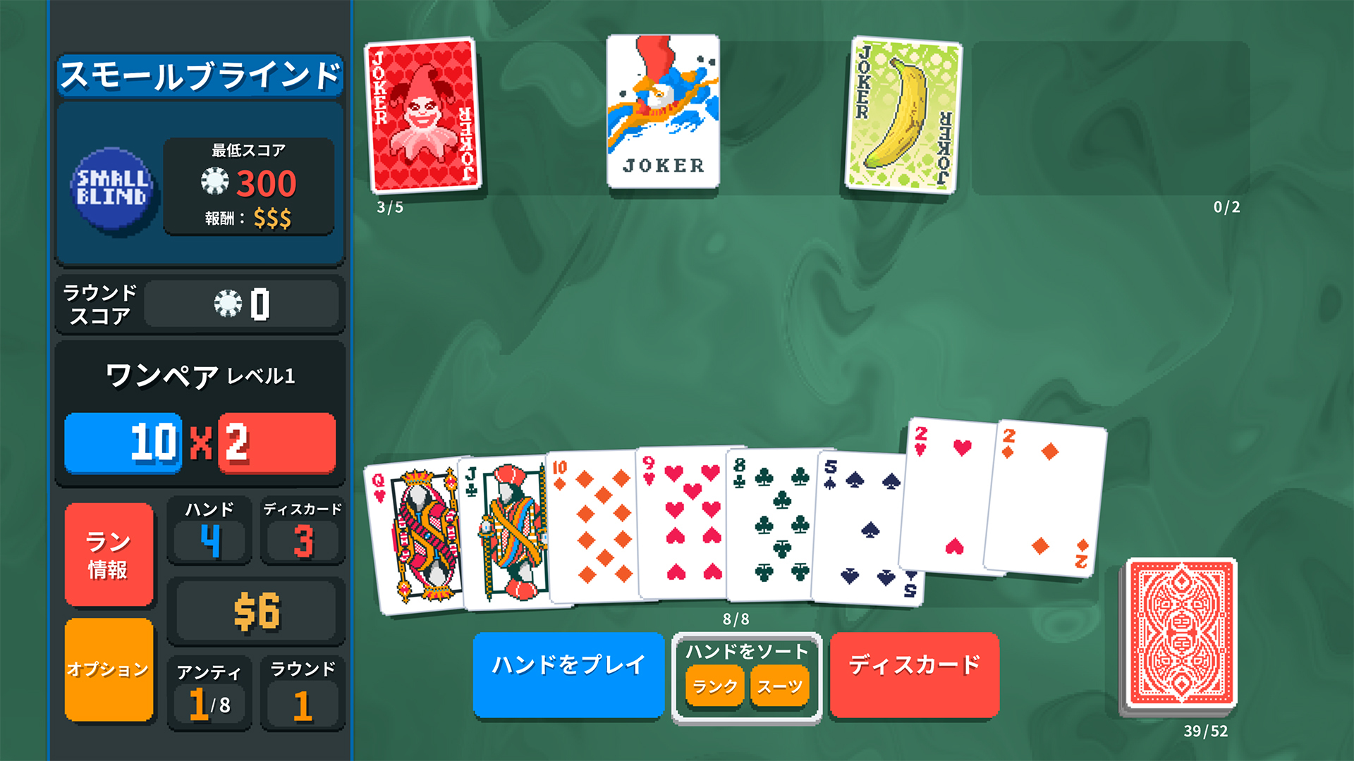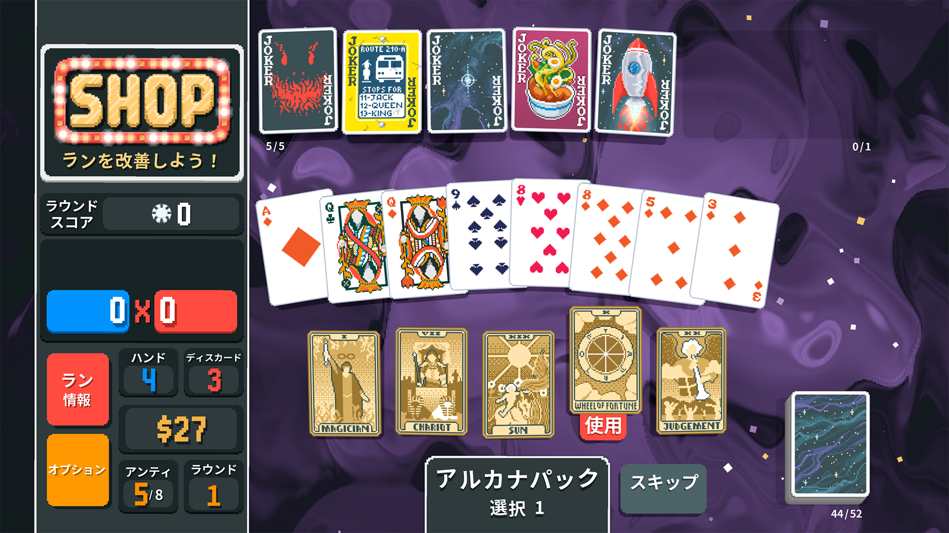 ユニークなジョーカーカードでシナジーやビルドを作って、強い役を組み合わせましょう。隠れボーナスハンドやデッキを発見して、たくさんチップを稼いで、ウザいブラインドをやっつけましょう。ボスブラインドに到達するには、様々な戦略が必要です。最終アンティにも負けずに、勝利をものにしましょう。