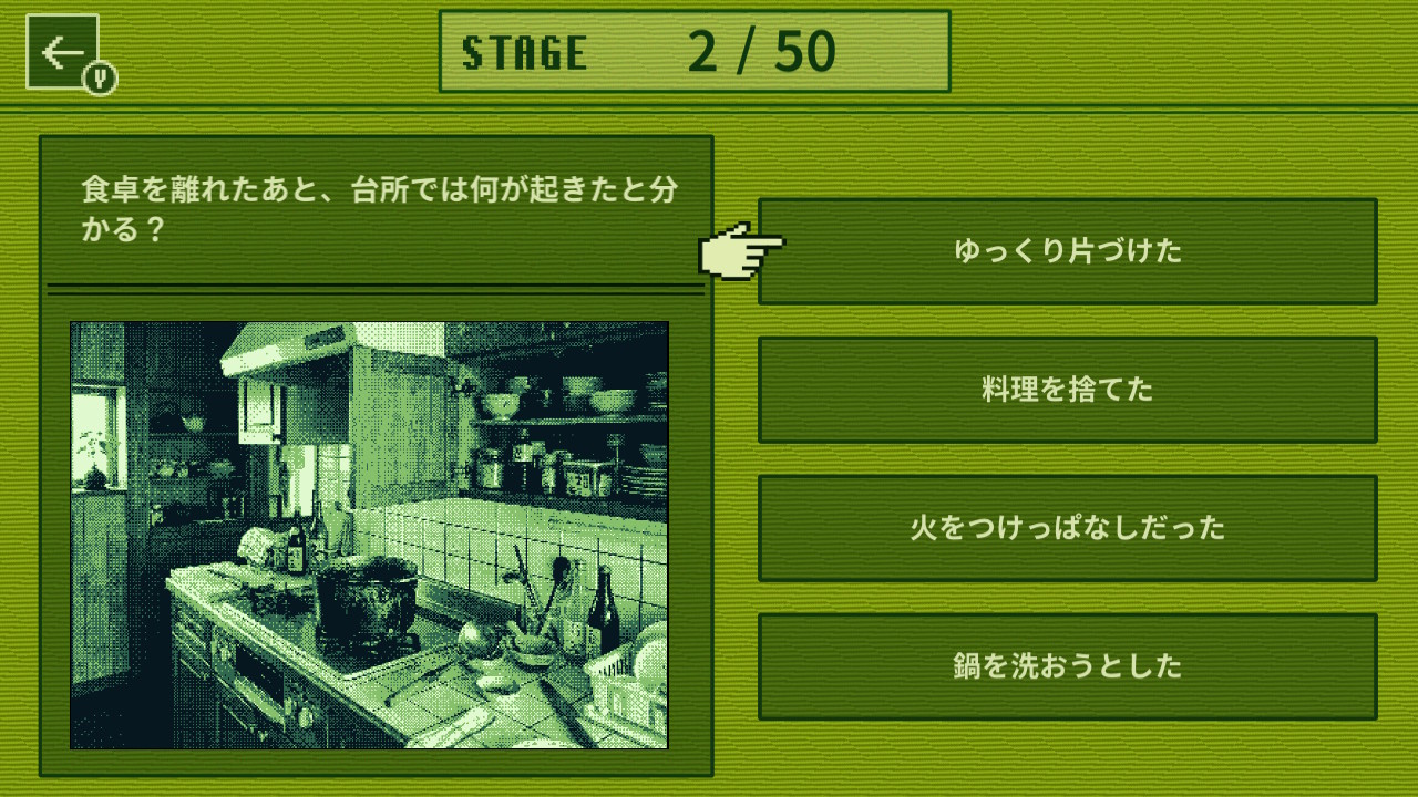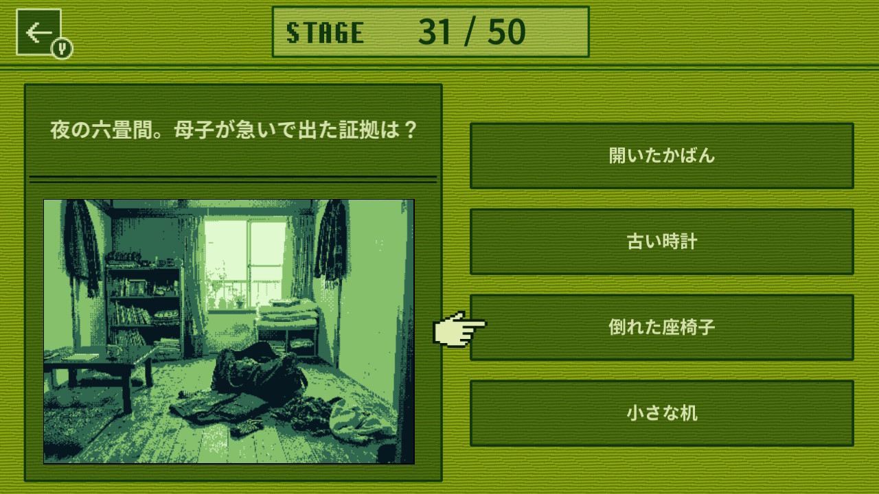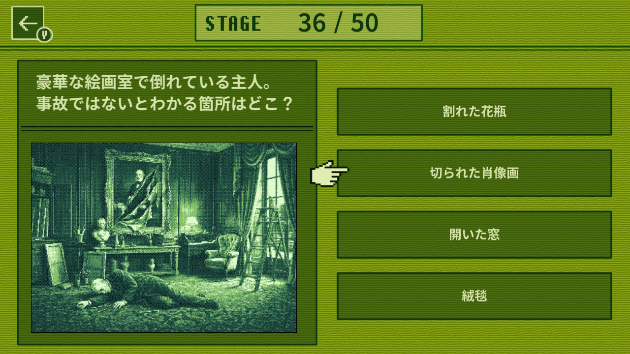 違和感や手がかりを見つけながら事件の真相に迫る4択推理ゲームです。