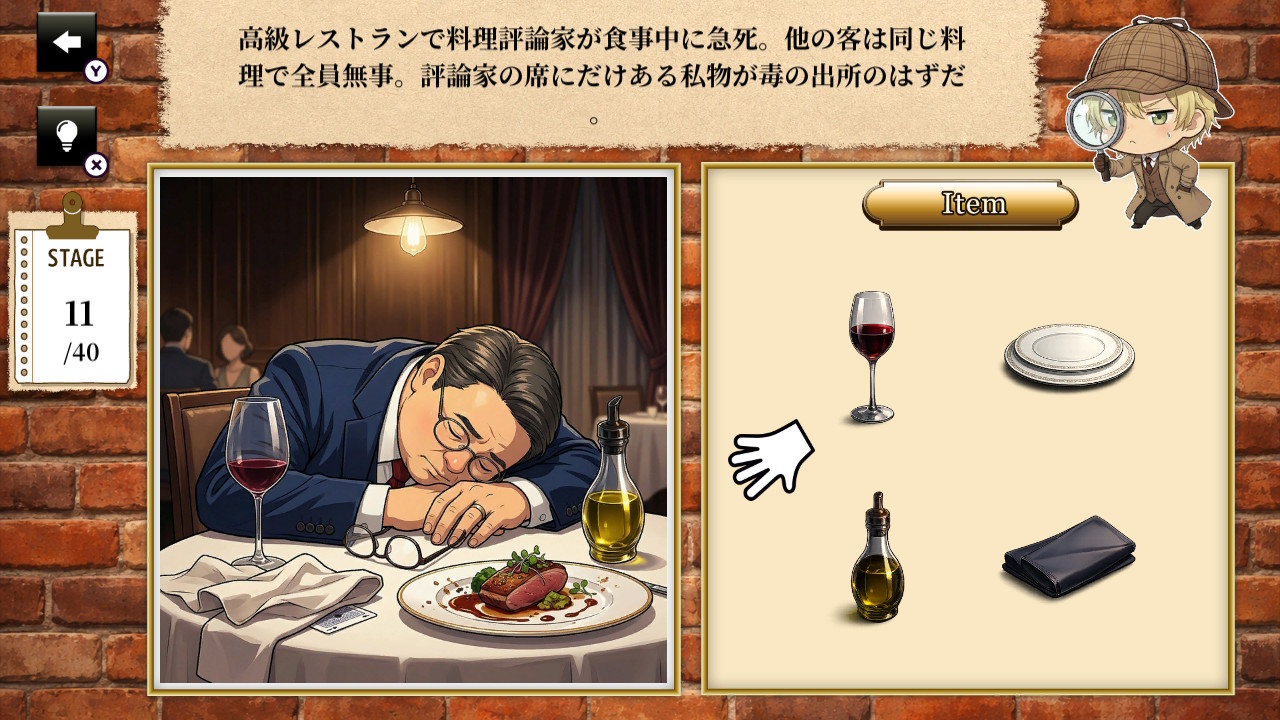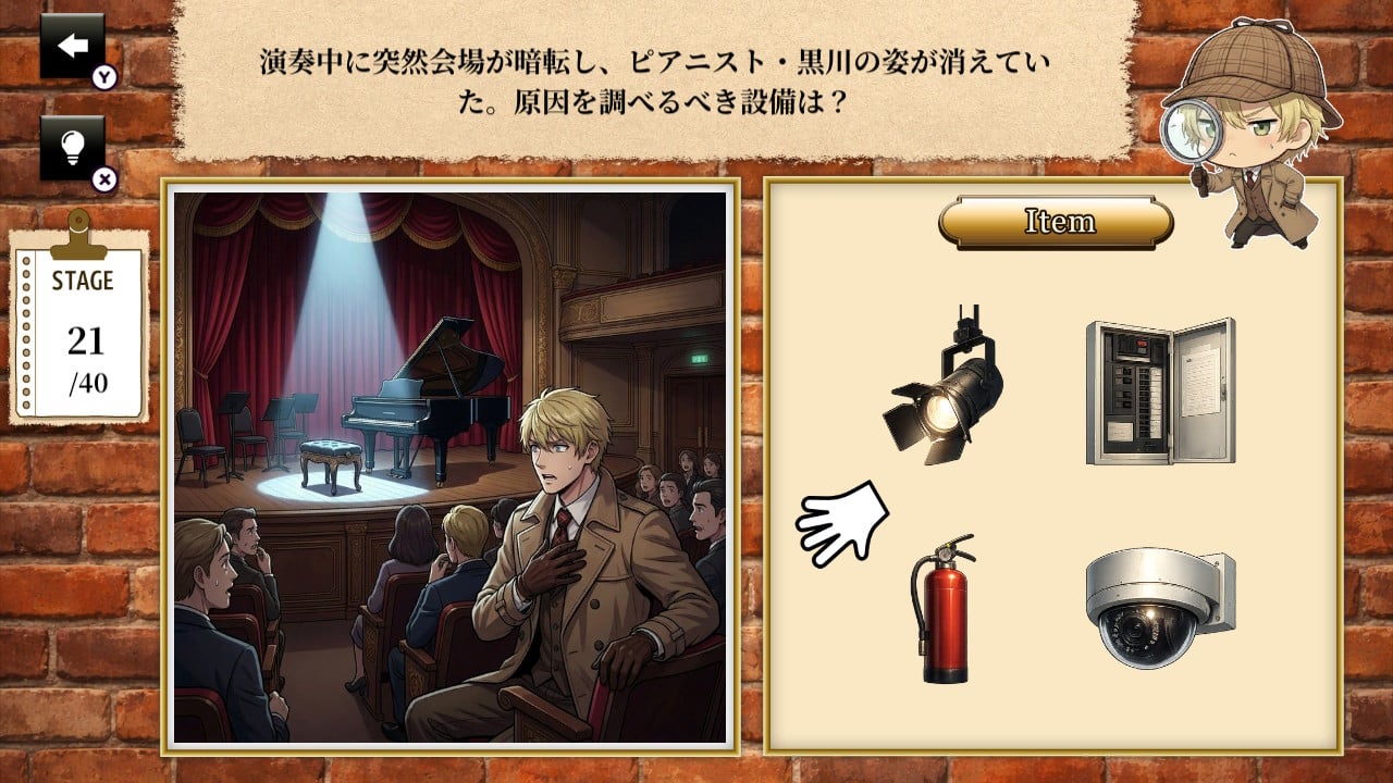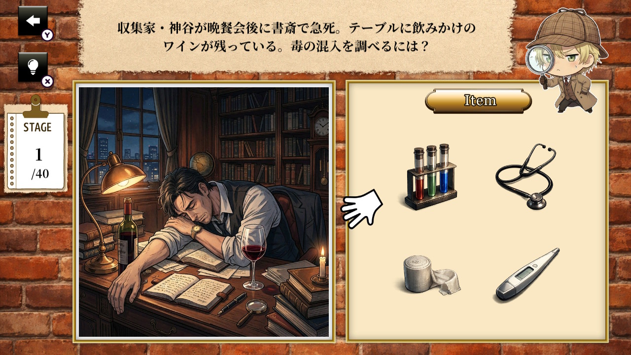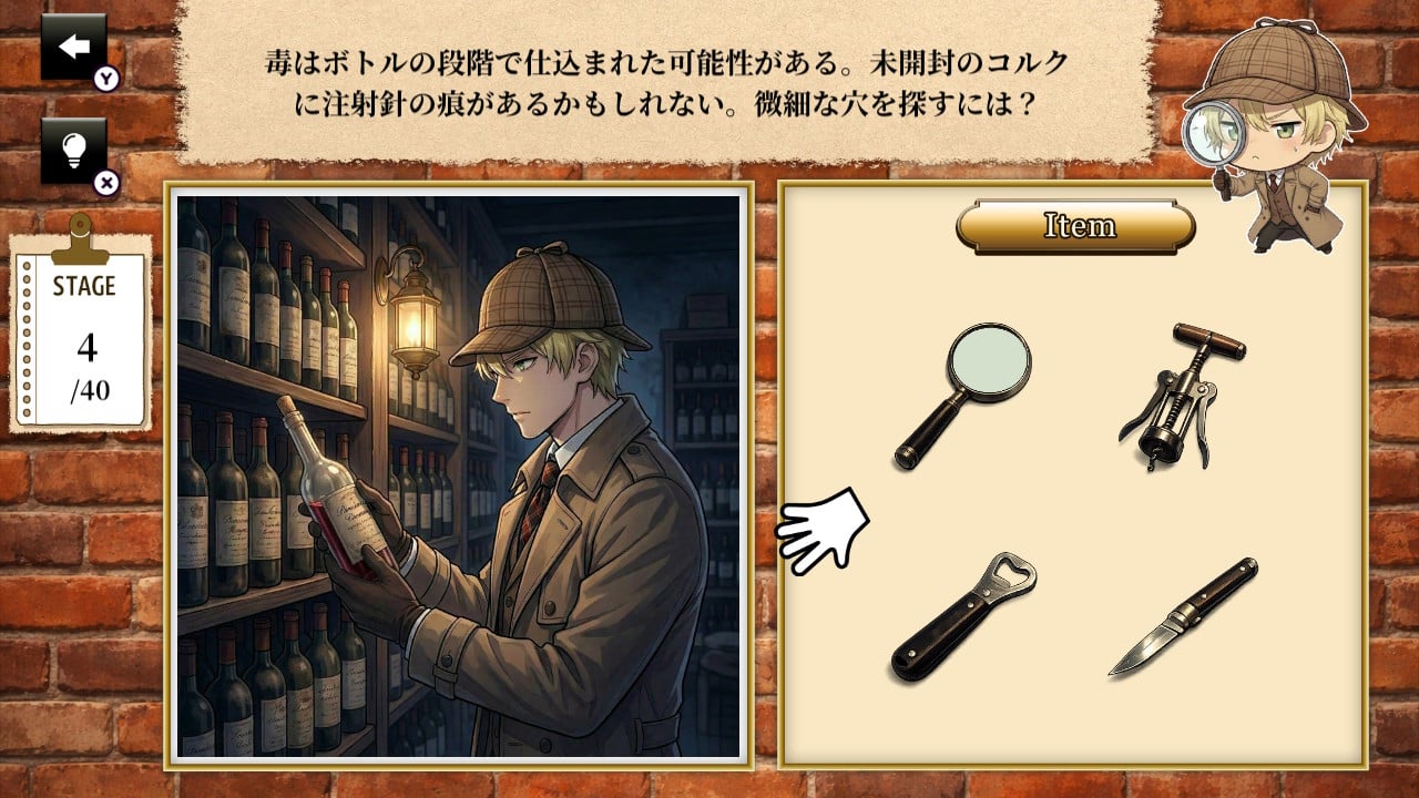 キャラクターとともに事件を追い、4つのアイテムから推理に役立つ選択肢を選び、真相に迫る“推理型ナゾトキゲーム”です。