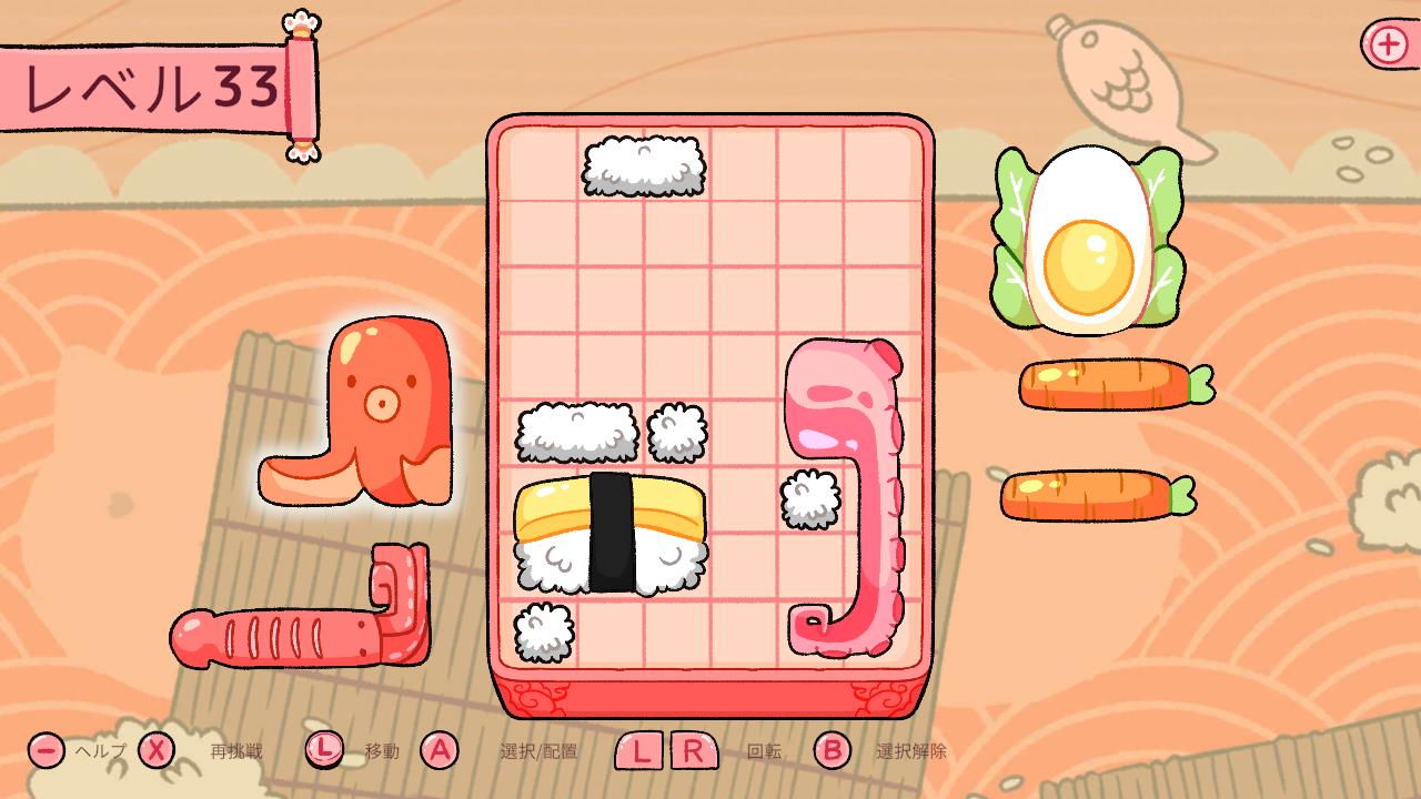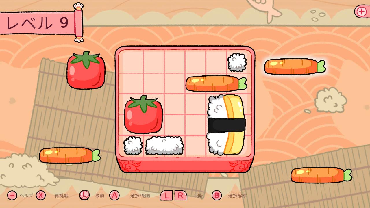 レベルが上がるごとに、ランチボックスのサイズや内容が変わります。スペースが増えたり(あるいは減ったり)、新しいスナック(こんにちは、豆腐!)や、ライスプルプやお団子のような新しい障害物も登場します。これはかなり満腹になる一品です!